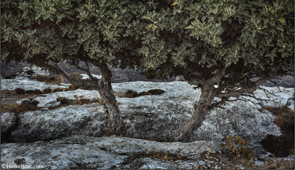 Manchmal, so wie bei Anogia an den Hängen des Psiloritis, wachsen Olivenbäume an ungewöhnlichen Orten. Sie tragen keine Früchte, sind wilde Verwandte des Baumes, der von den Bauern veredelt wird, damit er Früchte trägt. Vielleicht ist ein Kern von einem Vogel in einer Felsspalte versenkt worden, hat dort langsam Wurzeln geschlagen und ist über Jahre langsam gewachsen. Hat seine Wurzeln in den Stein gekrallt, ihn zur Seite gedrückt, sich gemächlich Raum geschaffen und Furchen gesprengt, in denen sich Wasser sammeln konnte. Ist dort geblieben, sein Stamm ist mit der Zeit grau und rissig geworden wie der Berg, der sein Zuhause ist. Diese verwilderten Bäume bieten dem Wanderer und dem Hirten Schutz vor Regen und Sonne, einladende grüne Rastplätze in der Stille hoch oben am Rand der Nida-Ebene. Es ist ein schöner Ort, der einen lehrt, der Stille zuzuhören, dem Wind in den Felsen und dem Flüstern der Blätter. Manchmal ist nur noch der Flügelschlag der vorbeiziehenden Vögel zu hören in der Einsamkeit.